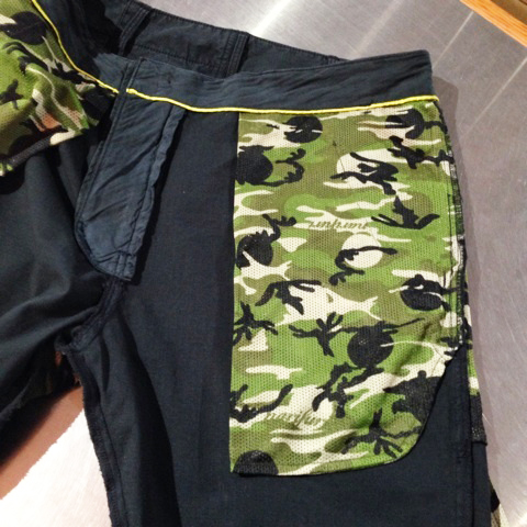 ウエスト裏側にはパイピングのアクセントも。ヒップ部分もメッシュ素材で二重仕立に なっており、補強の役割を。