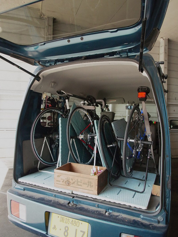 店長の撮影&サポートカーに積み込みます。おふろマット大活躍。