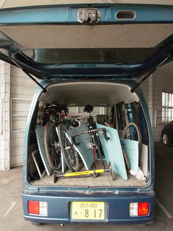 自己紹介と自転車オールスターズ。店長の撮影&サポートカーは試乗車満載。