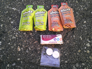 おなじみショッツのグリーンプラム2個とコーラバニラ2個、新しく入荷した井村屋のスポーツようかん。エクストラライトショッツ(タブレット)。