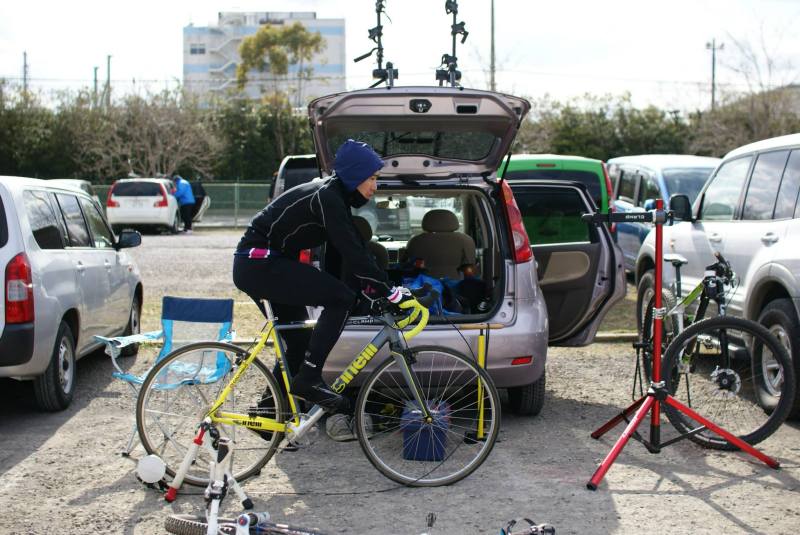 ウォーミングアップはいつも通りローラー台にて。さむくてフードまでかぶる始末(涙)