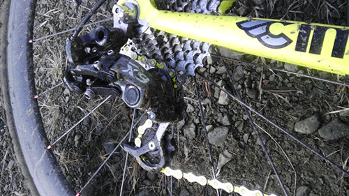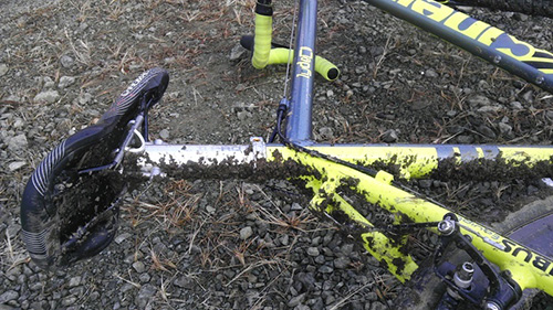 急きょ泥コンディション用のホイールに履き替えてバイクにセット。